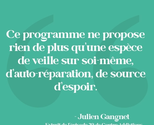Voilà ce qu’on peut lire au début de son livre « Les 12 étapes, la méthode qui a transformé des millions de vies » aux Editions de La goutte d’or. L’histoire d’amour entre la drogue et Julien Gangnet prend très tôt son envol, loin des cours d’école qu’il déserte rapidement. Il trouve une bande de gens comme lui, égarés. Des ados en souffrance souvent, venant de milieux sociaux défavorisés, et de familles éclatées et dysfonctionnelles. Un père violent, une mère alcoolique, une trouille démesurée de la vie dans sa globalité le poussent à trouver un apaisement dans la consommation de drogues de plus en plus « dures ». À 17 ans, c’est un coup de foudre, écrit-il, avec l’héroïne. Un soulagement intense s’empare de lui dès la première prise. Mais ce sentiment d’apaisement s’estompera vite, pour laisser place au manque, à une existence misérable de recherche incessante de produit, mais surtout à une dépendance grandissante et ravageuse. Malgré des tentatives solitaires de décrochage, l’héroïne ne le quittera jamais plus de quelques jours. Le vide et l’absence d’espoir sabotent chacun de ses efforts. Jusqu’à ce jour de hasard dit-il, où la rencontre qui mettra fin à cette malédiction qu’il pensait définitive. Que s’est-il passé ce jour-là ? Comment une salle défraîchie du 10ème arrondissement, remplie de toxicos qui ne se droguent plus, a changé le cours de sa vie ? Ne pas consommer n’est que le début de l’histoire. La sobriété et le rétablissement qui attendent les « pratiquants » des 12 étapes est un miracle qui se vérifie partout dans le monde, un jour à la fois.