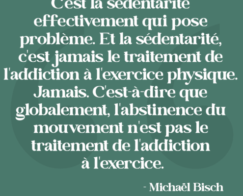 💬 « Ce qui est certain, c’est que certaines activités physiques sont très pourvoyeuses de ces neurotransmetteurs-là. Et là, il faut plutôt être prudent. C’est-à-dire que globalement, l’idée, justement, c’est de ne pas remplacer une addiction par une autre… Si, pour avoir ma sécrétion de neurotransmetteurs, je me détruit les muscles et j’ai besoin d’en faire toujours plus. ».